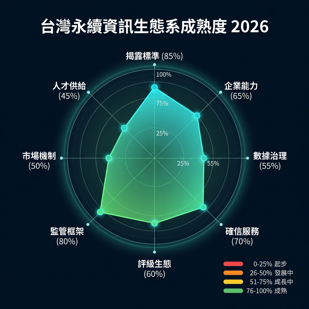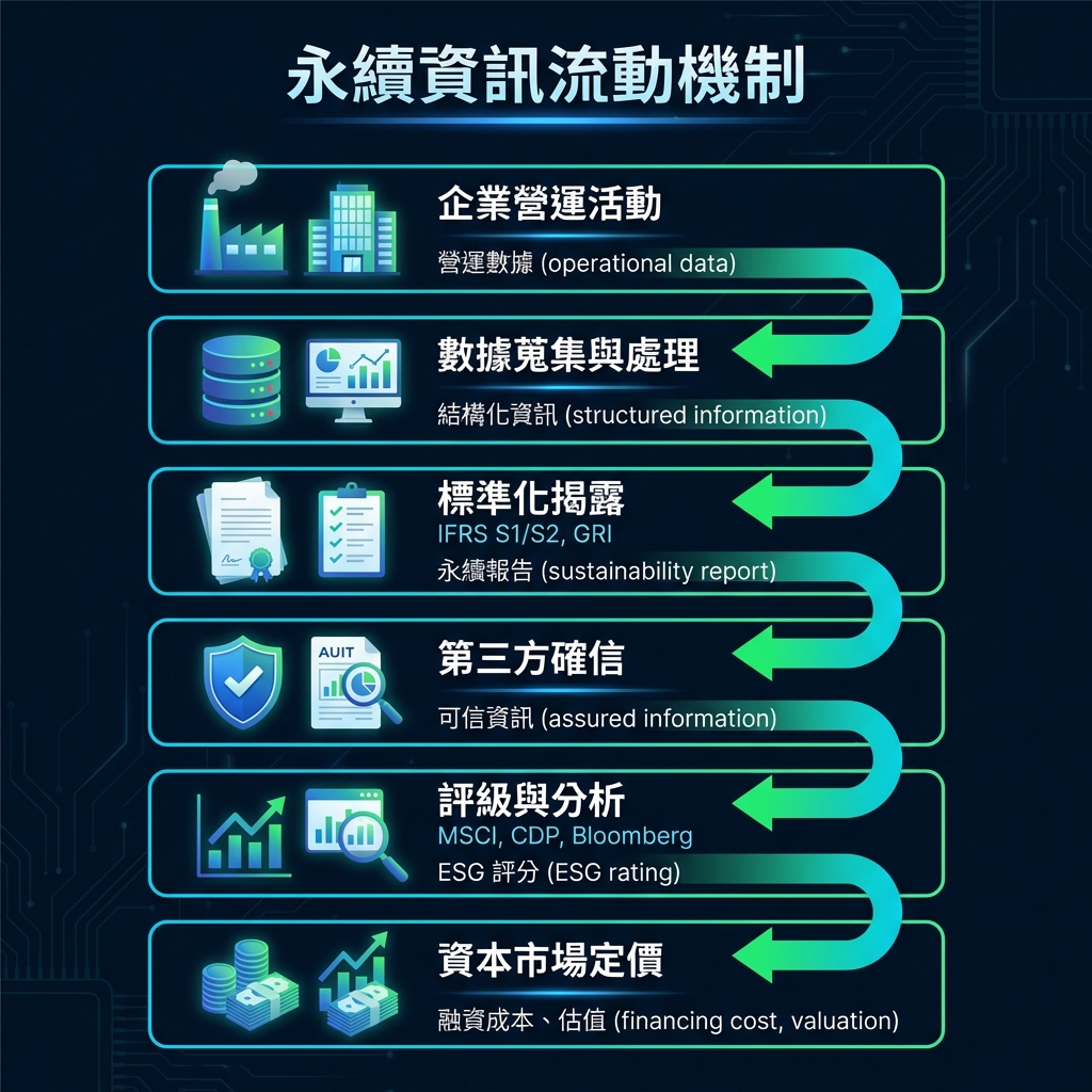 這張圖展示了永續資訊生態系的 8 個核心組成,以及它們之間的資訊流動關係。 從揭露標準的制定,到企業產生資訊,經過數據處理、確信驗證、評級分析,最終影響資本市場定價, 形成一個完整的閉環系統。